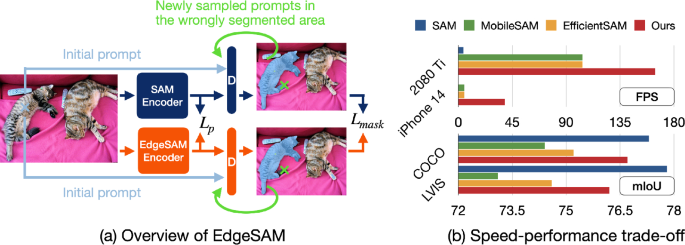 性能方面,EdgeSAM 相比原始 SAM 提速约 40 倍,在边缘设备上的速度高于 MobileSAM 约 14 倍,并在 COCO 和 LVIS 数据集上的 mIoU 分别提升了约 2.3 和 3.2 个百分点。它是首个能够在 iPhone 14 上实现超过 30 FPS 实时分割的 SAM 变体。